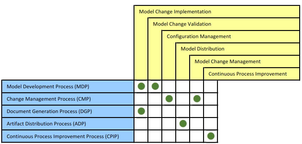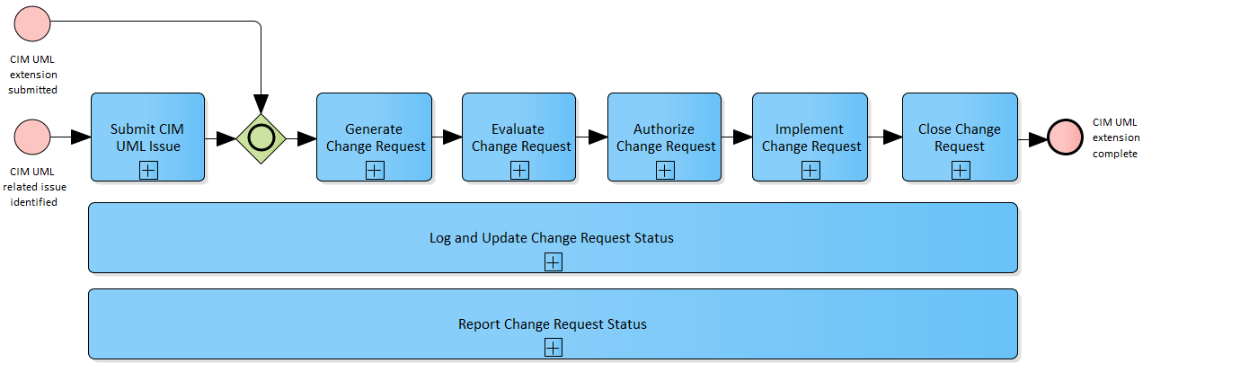 | Change Management | The Change Management Process establishes an orderly and effective procedure for tracking the submission, coordination, review, evaluation, categorization of change requests, and approval for release of changes to CIM UML baselines. The Change Management Process is shown in Figure 4‑5. Changes can either be modifications to existing model elements or the creation of new model elements. |