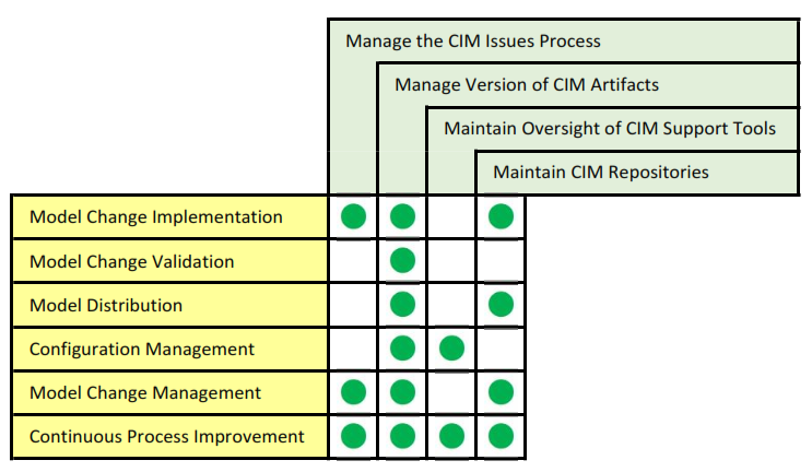 The CIM Model Managers perform most of the tasks within the CIM management processes. There are however, other roles within the CIMug and IEC working groups that also perform CIM management tasks. The following table provides a description of each role and its mapping to CIM management processes.