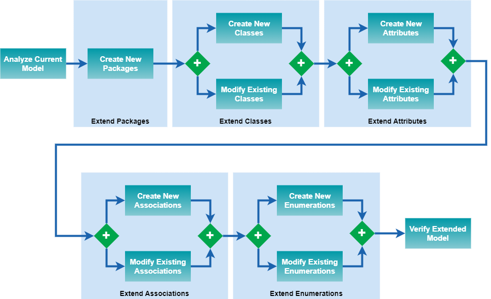 | Model Development | The model development process is the core CIM UML process. It is executed to extend the CIM UML and create a new baseline of the CIM UML. This process is triggered by any one of the roles that is responsible for model development. The model development process flow is shown in Figure 4‑4. CIM Management is performed as part of the “Verify Extended Model” subprocess. |