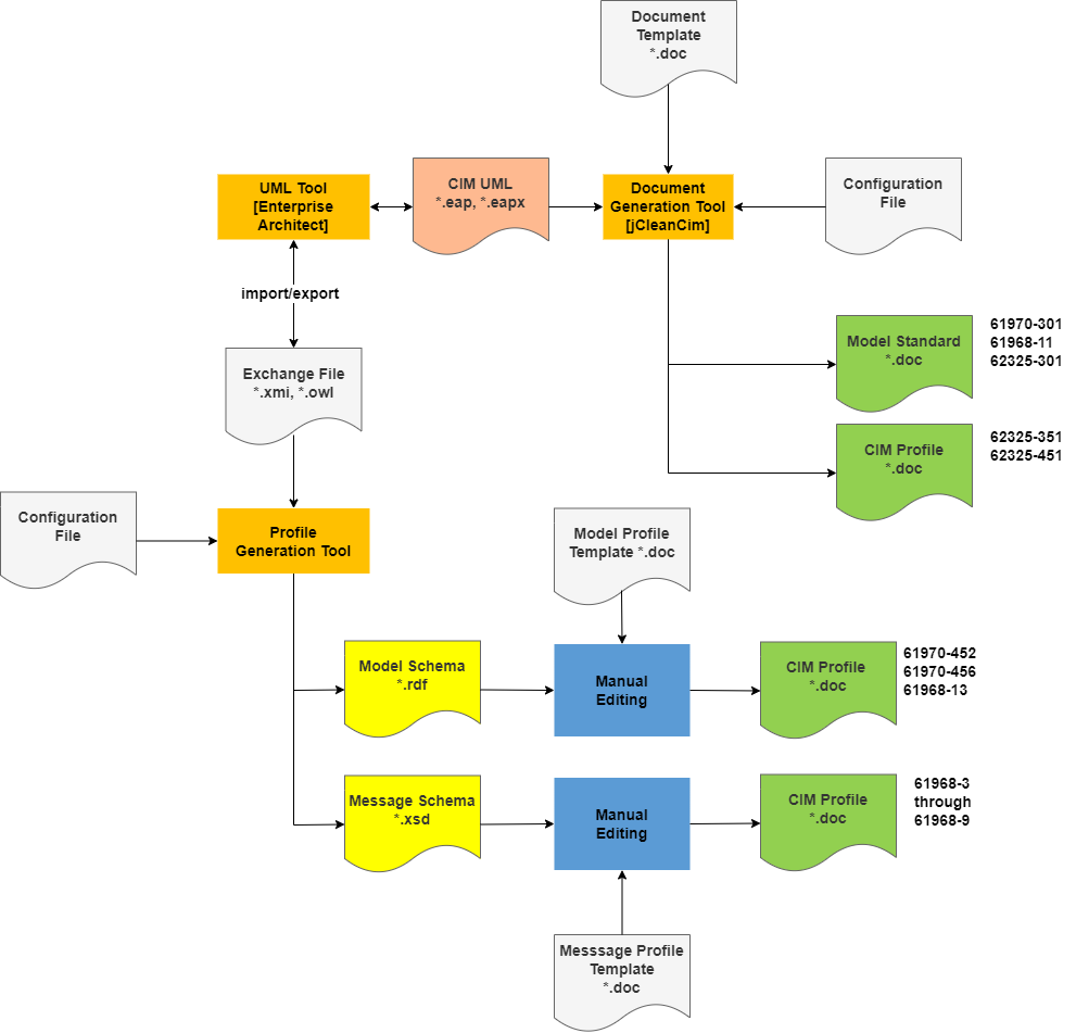 | Document Generation | The document generation process involves the creation of the document artifacts associated with the CIM. The CIM UML is used to create these documents as exemplified in Figure 4‑6. CIM Profiles (including RDF and XML schemas) are generated by the IEC working groups. CIM Model Managers may assist working groups in creating RDF and XML schemas. All other artifacts under CIM Management are generated by CIM Model Managers. |
